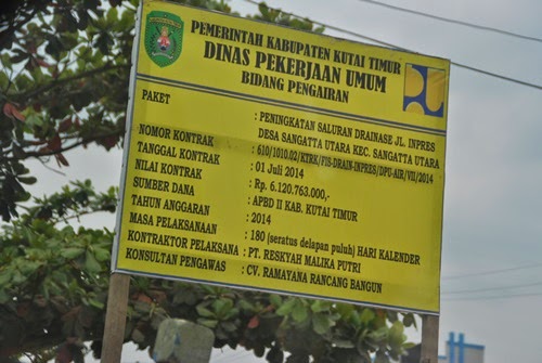Kedua paket yang sama-sama ditargetkan berakhir Desember nanti itu, semuanya murni dibiayai APBD Kutim. Pada papan proyek, untuk peningkatan saluran drainase dengan kontrak nomor 610/1010.02/KTRK/FIS-DRAIN-INPRES/DPU-AIR/VII/2014, dialokasikan dana Rp6,1 M. Protek yang dimulai 1 Juli 2014 ini, dikerjakan PT Reskyah Malika Putri dengan konsultan pengawas CV Ramayana Rancang Bangun.