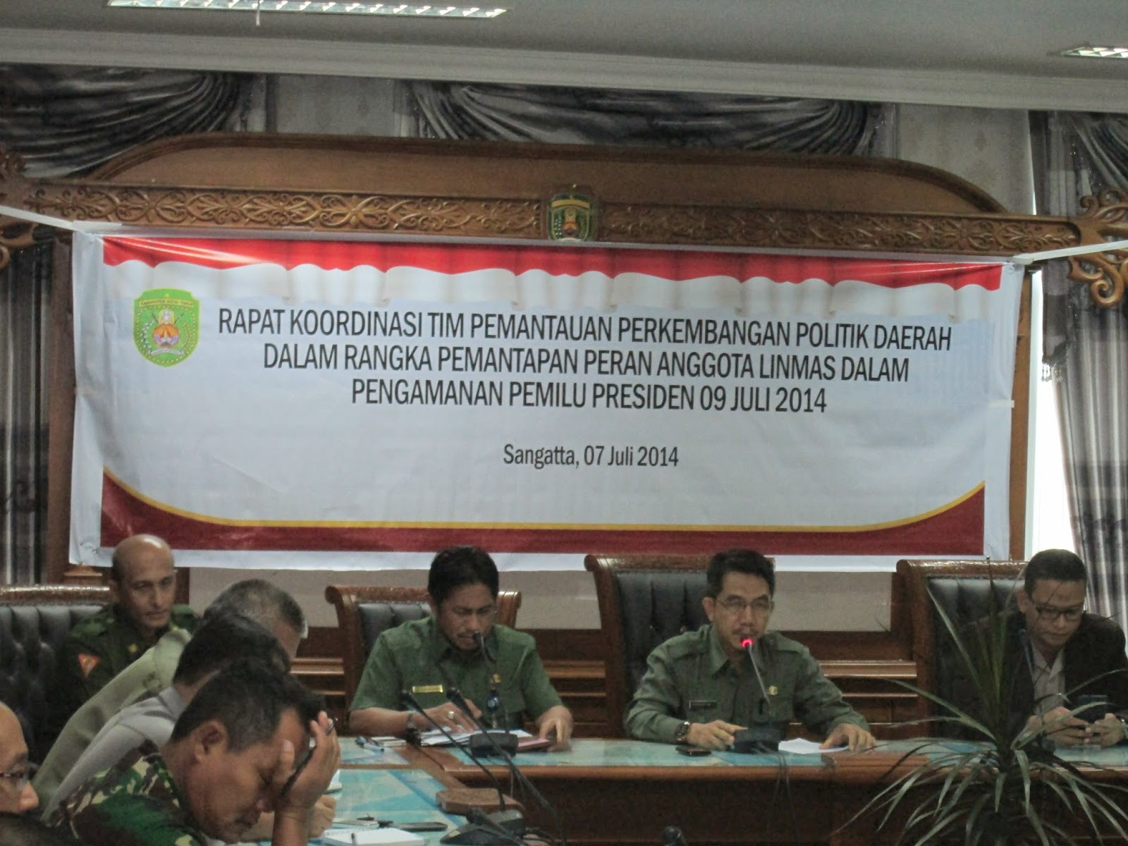 Hal itu terungkap dalam Rakor Tim Pemantauan Politik Dalam Daerah dalam rangka Pemantapan Peran Anggota Linmas Dalam Pengamanan Pilpres 2014, Senin (7/7) di Ruang Arau Setkab Kutim. “Camat diharapkan bisa berperan aktif membantu kelancaran pelaksaan Pilpres yang tinggal dua hari, karena itu camat selalu ada ditempat sehingga memudahkan koordinasi semua pihak,” kata Wabup Ardiansyah Sulaiman.