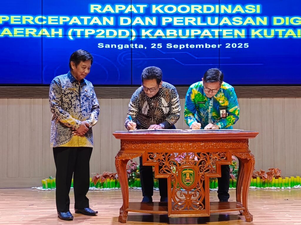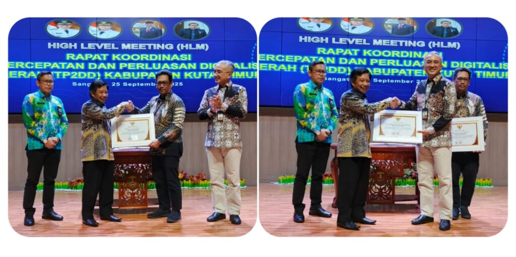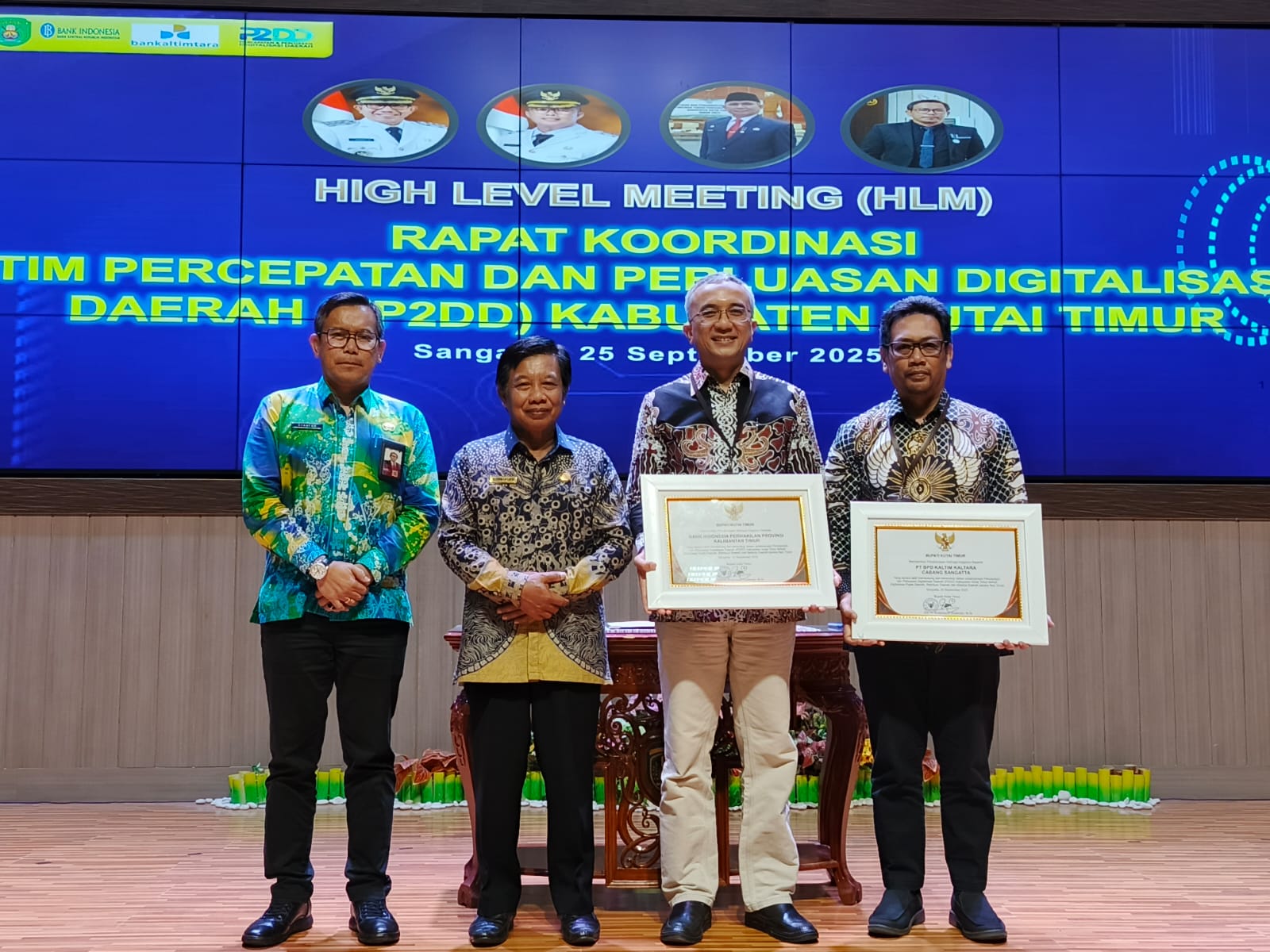 Penghargaan dan apresiasi ini diserahkan Asisten Administrasi Umum (Admum) Pemkab Kutim, Sudirman Latif didampingi Kepala Bapenda Kutim Syahfur yang diterima langsung Agus Taufik selaku Deputi Kepala Perwakilan Kantor Perwakilan Bank Indonesia Kaltim serta Kepala BPD Kaltimtara Cabang Sangatta Marliansyah, dalam Rakor Tim Percepatan dan Penyebarluasan Digitalisasi Daerah (TP2DD) Kabupaten Kutai Timur Tahun 2025, bertempat di ruang Meranti Kantor Bupati Kutai Timur, kawasan Bukit Pelangi, Sangatta, Kamis (25/9/2025).