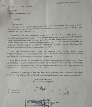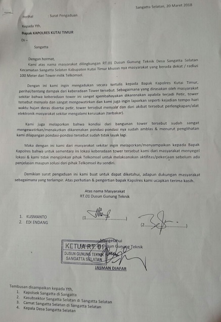 Dalam surat yang disampaikan ke Kapolres Kutim AKBP Teddy Ristiawan itu, disebutkan kondisi pondasi tower yang tidak layak dan mengancam keselamatan warga sekitar tower. Melalui surat yang disebutkan telah disampaikan ke Polres Kutim, Rabu (21/3) itu, ditegaskan warga sudah meminta Telkomsel tidak memfunsikan tower yang ada sebelum ada kejelasan serta perbaikan. “Kami ingin tenang beristirahat, kini takut ditimpa tower itu selalu menghantui kami termasuk anak-anak yang sedang sekolah di SMP Negeri 1 Sangatta Utara,” ujar Kusmanto yang mengaku 2 televisinya kini rusak.