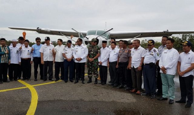 Wabup Kasmidi Bulang bersama Danlanal Sangatta Letkol Laut P Mulyan Budiarta serta undangan lainnya berfoto bersama depan Pesawat Susi Air pada penerbangan perdana tahun 2018.